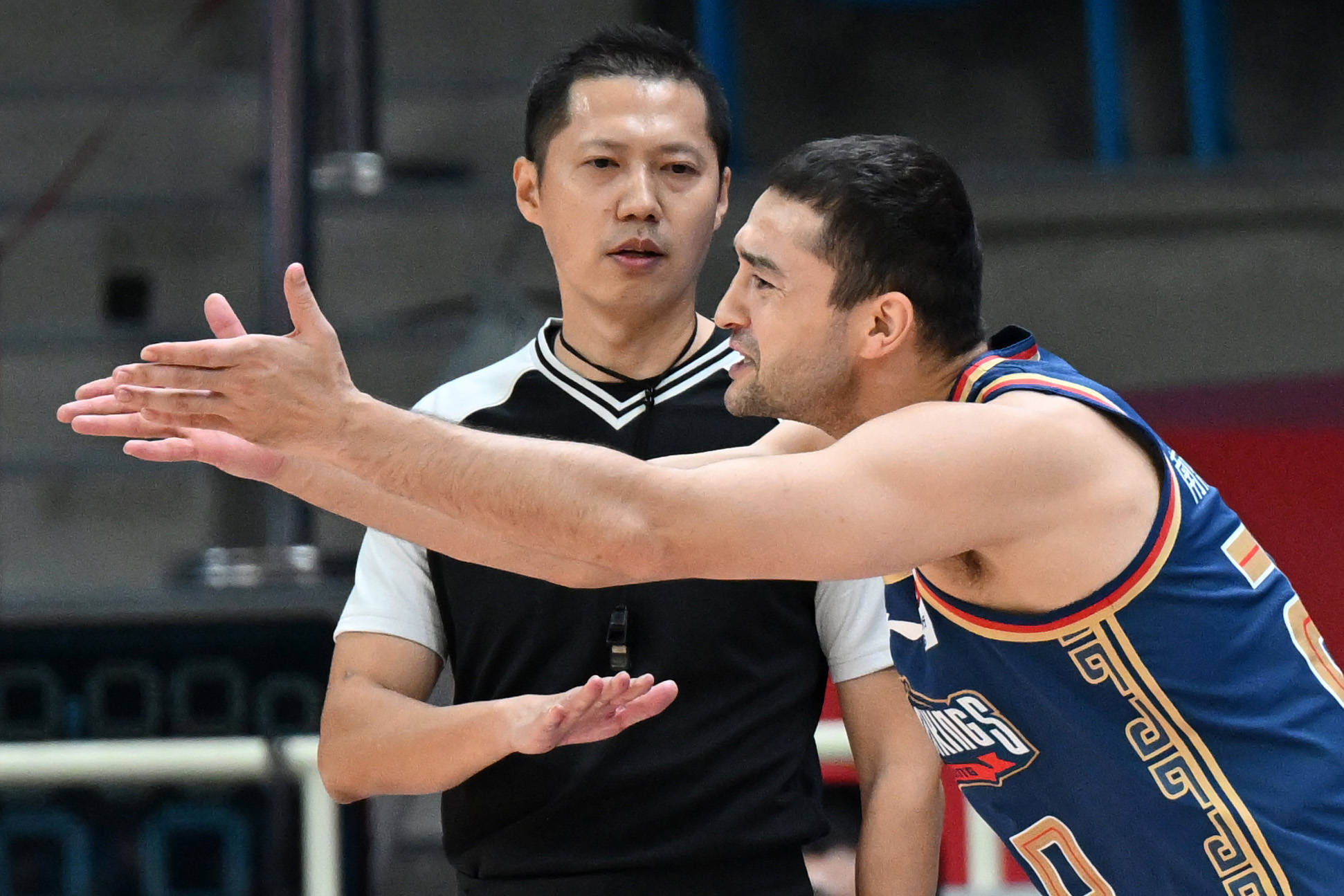 10月20日,南京同曦宙光队主教练兼球员西热力江(右)对第一副裁判邓欣的判罚表示异议。新华社记者 陈振海 摄
