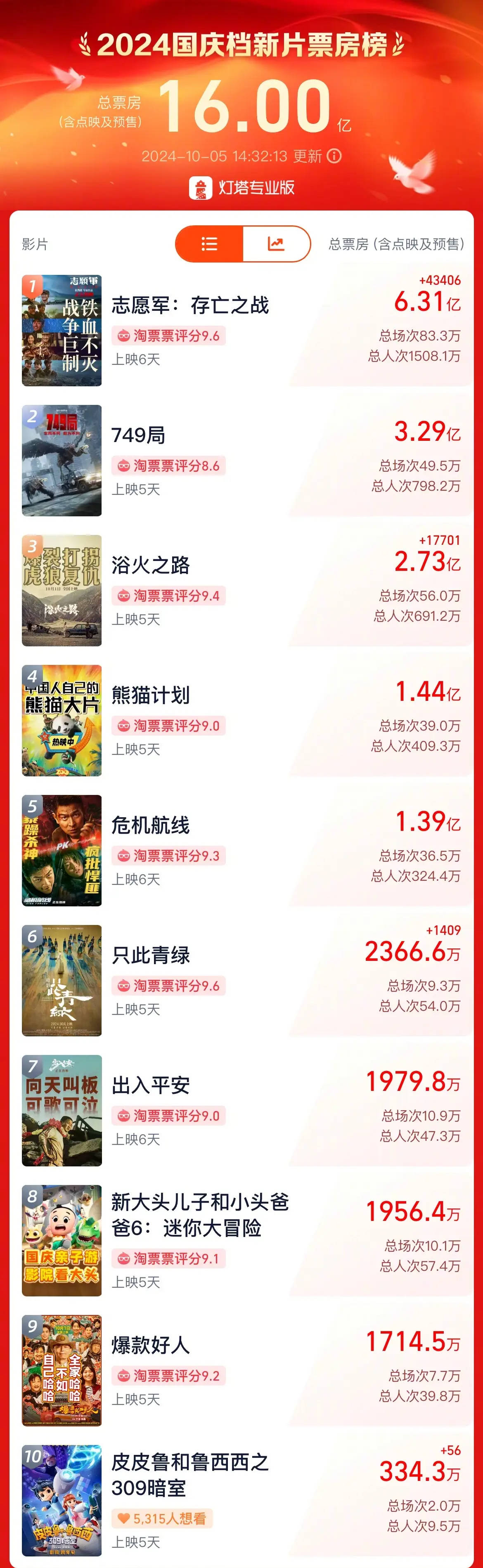 搜狐娱乐讯 据灯塔专业版数据显示,截至10月5日14时23分,2024年国庆档新片总票房(含点映及预售)突破16亿!《志愿军:存亡之战》《749局》《浴火之路》暂列新片票房前三名。