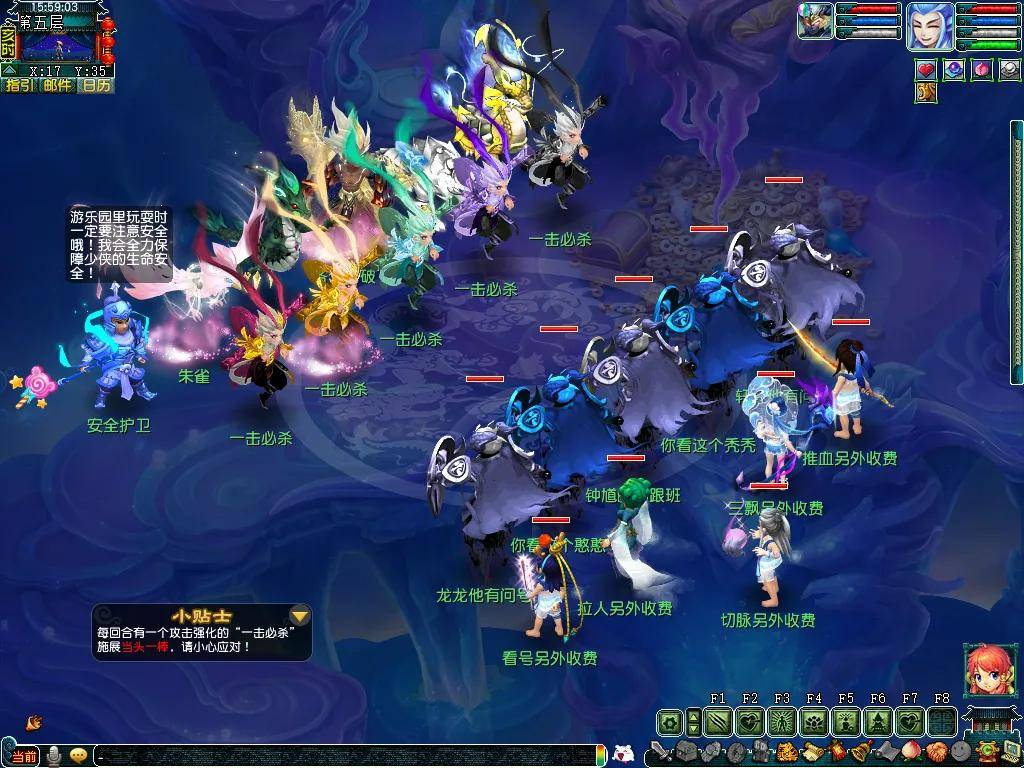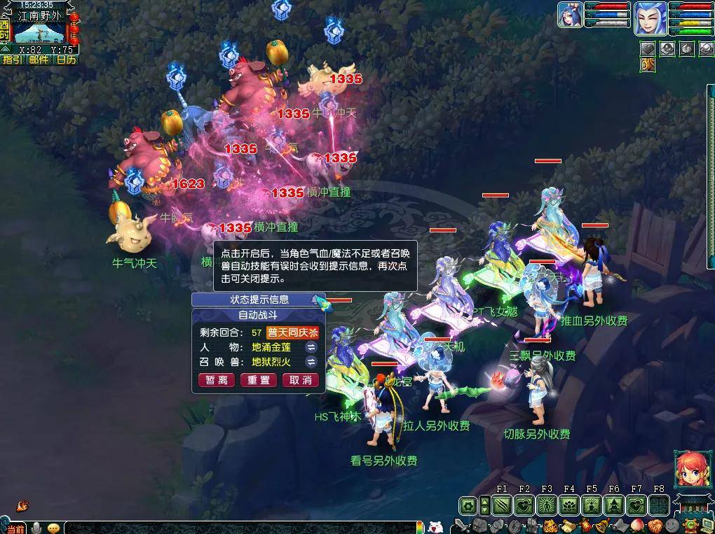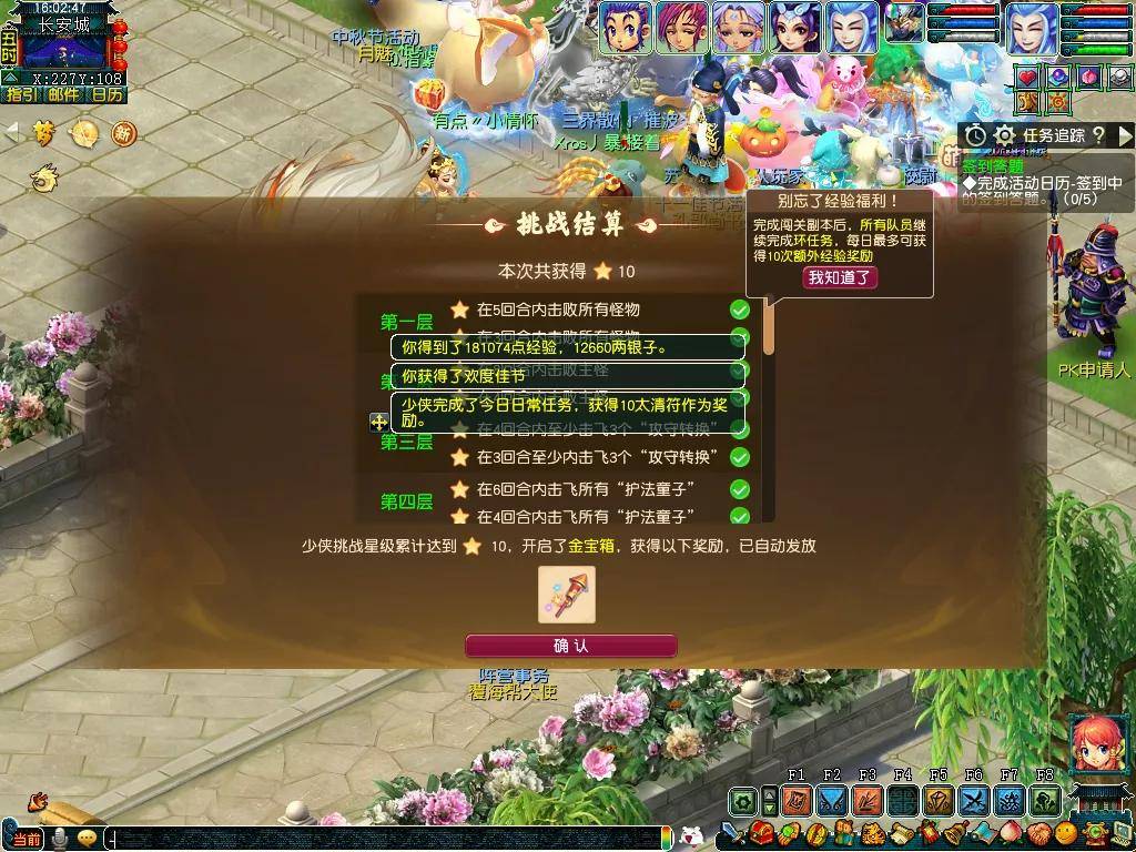 除此之外,本次活动的环任务非常人性化。首次领取任务时,可以获得“普天同庆”烟花,小型烟花可以增加挂机回合,大型烟花可以在战斗中使用酒肆、巫医技能,当自身和召唤兽血量、蓝量降低到一定水平时,还会触发系统提升!