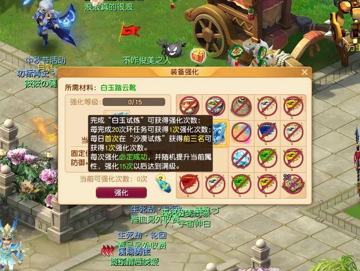 在十一佳节活动中,大家可以直接领取专属装备“白玉踏云靴”,每完成20次环任务可以得到1次强化次数,每日首次在“沙漠试炼”获得前三名可以获得1次强化次数,强化15次后达到满级。