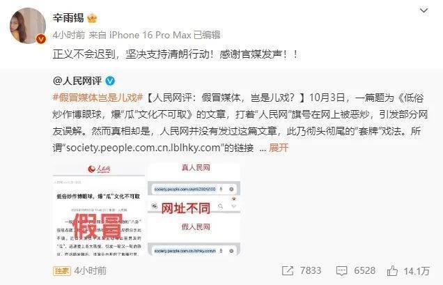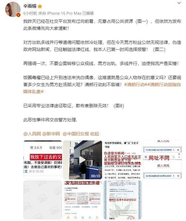 目前,辛雨锡转发“人民网评”微博,并称“正义不会迟到,坚决支持清朗行动!感谢官媒发声!!”