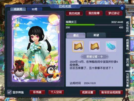 收集五条线索后,大家就可以获得一点限时成就,各位喜欢刷成就、提升成就的小伙伴可以在看到攻略后,立即前往神秘小屋收集线索。另外,大家可以通过古灯离开神秘小屋后会收到提示,10月5日晚上19点可以回到神秘小屋观看电影,会获得华胥境中的“限量外观”哦!