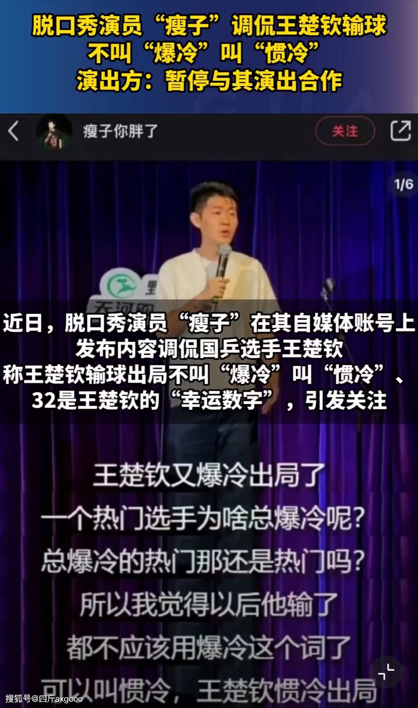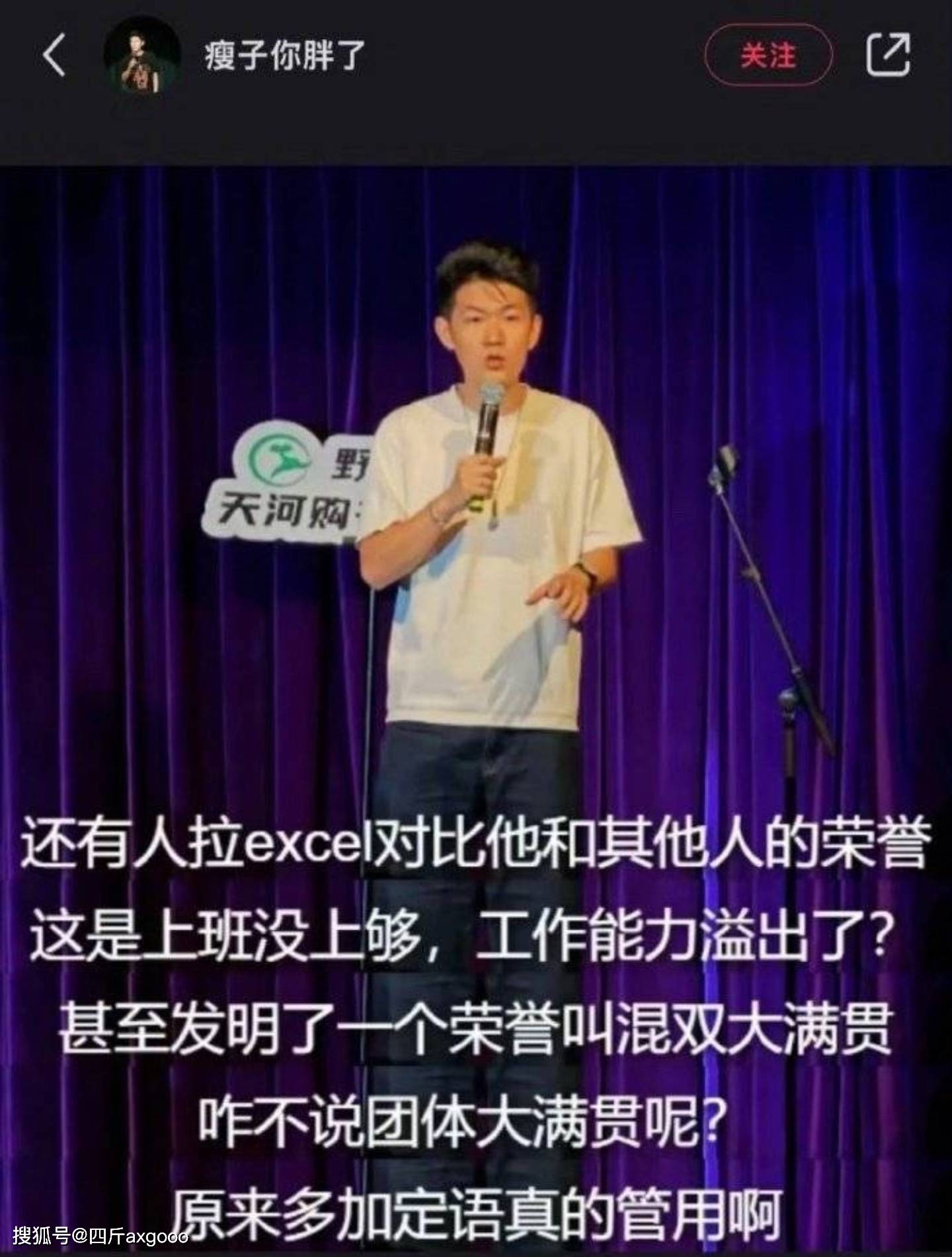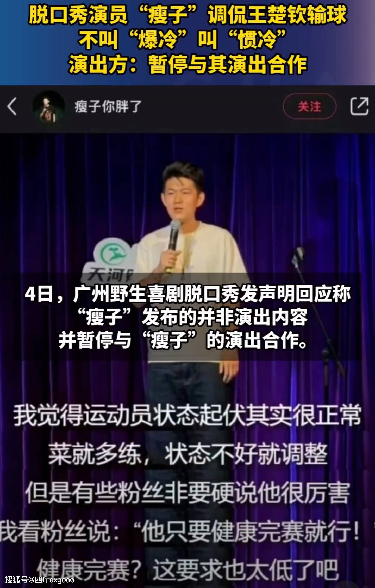 而咱们这位脱口秀界的演员“瘦子”同学,可能是觉得找到了流量的密码,直接在舞台上拿这事儿开涮了。