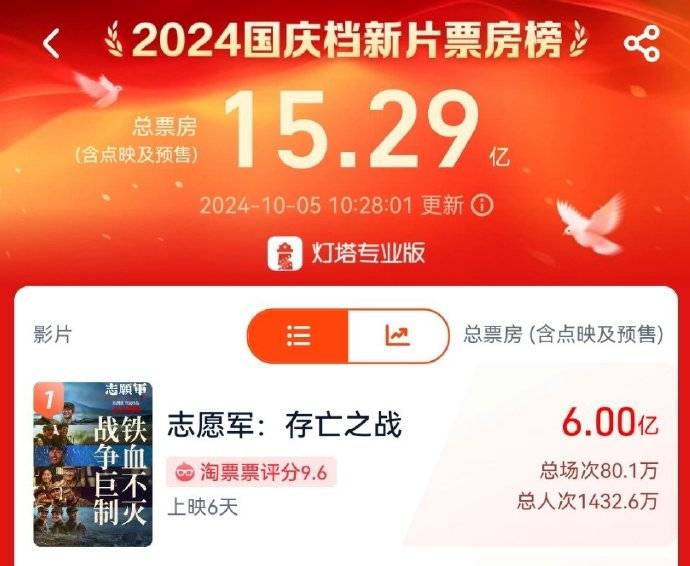 电影《志愿军存亡之战》的票房已经突破了6亿,而且预测票房还将连续5天上涨至14.67亿。一般来说,前几天的票房靠明星粉丝,接下来的票房就要靠路人口碑了。
