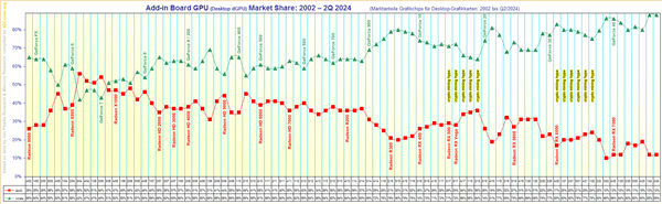 纵观20多年来的数据,趋势清楚地表明,NVIDIA自正式进入市场以来,一直保持着热度。