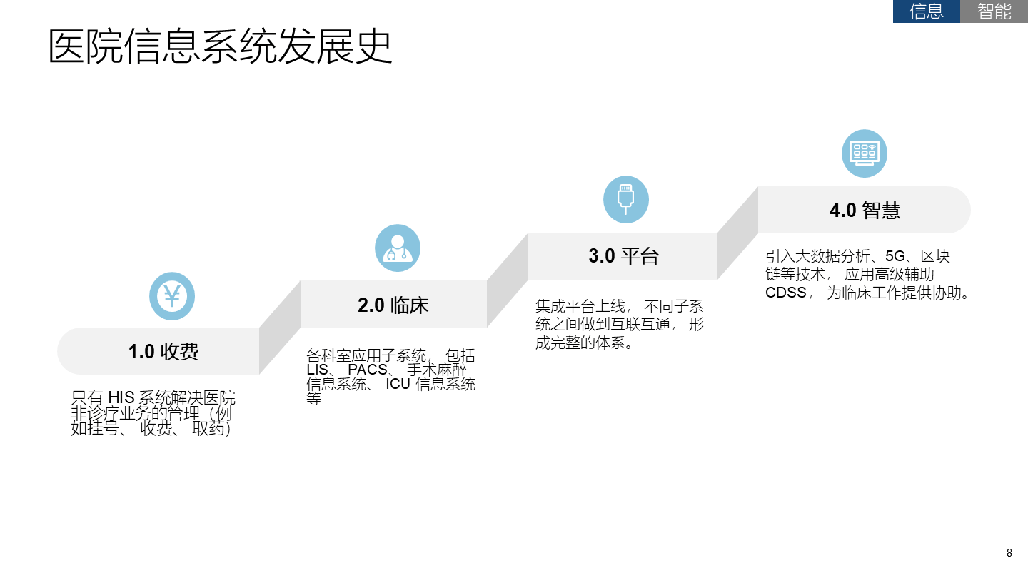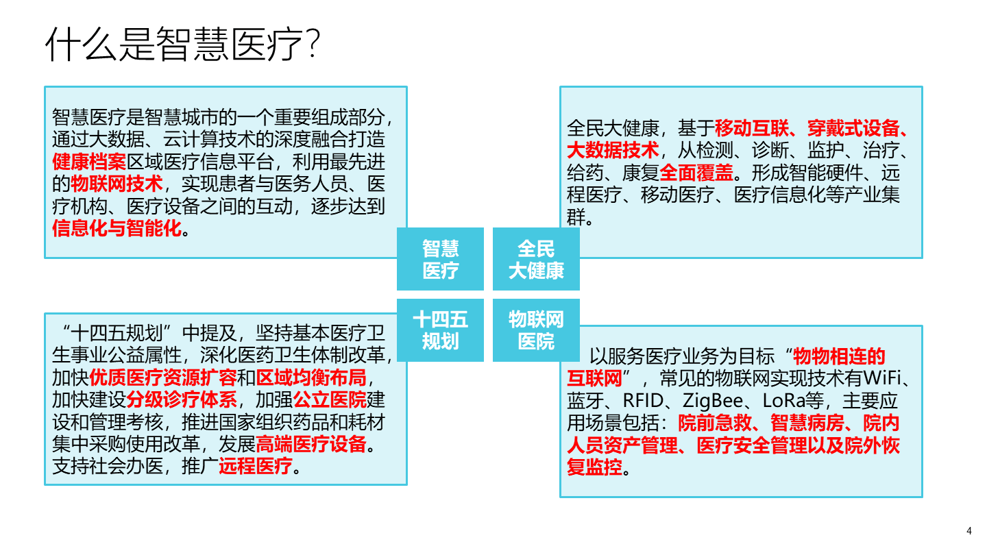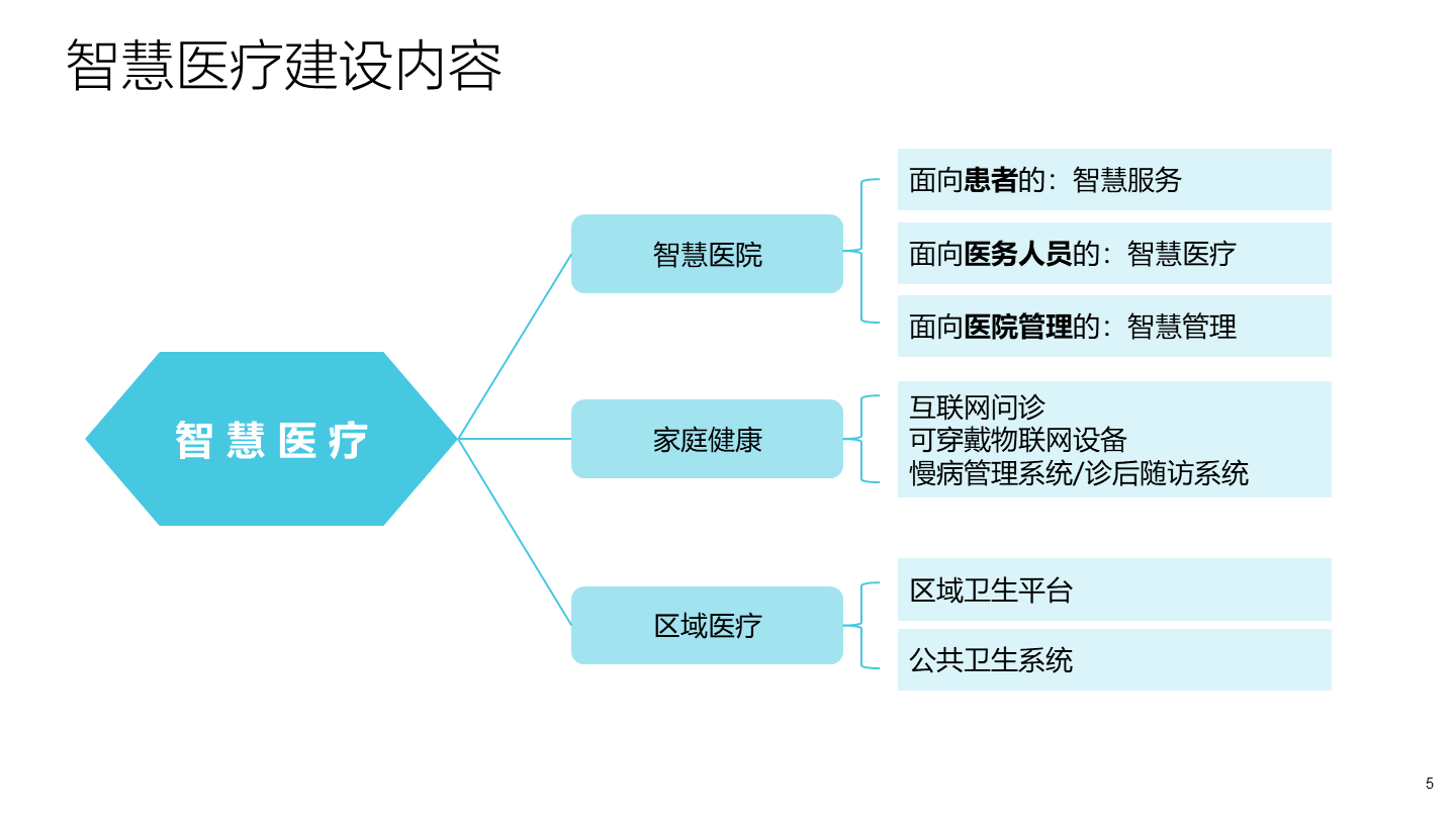 智慧医疗是智慧城市的一个重要组成部分,通过大数据、云计算技术的深度融合打造健康档案区域医疗信息平台,利用最先进的物联网技术,实现患者与医务人员、医疗机构、医疗设备之间的互动,逐步达到信息化与智能化。