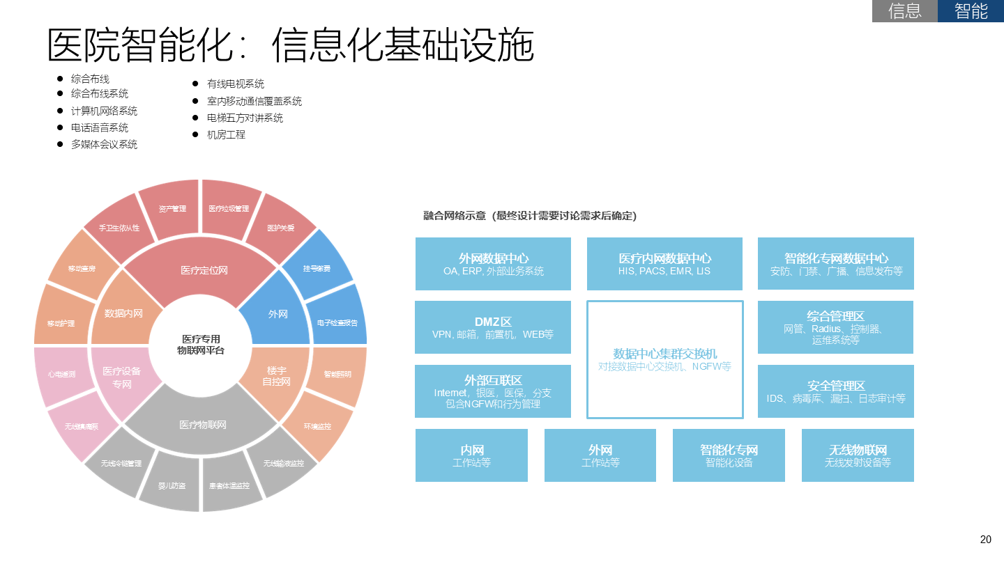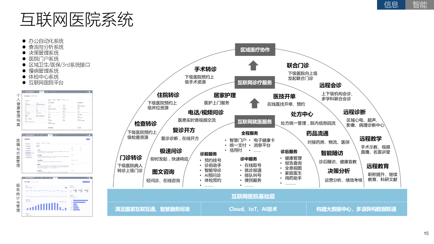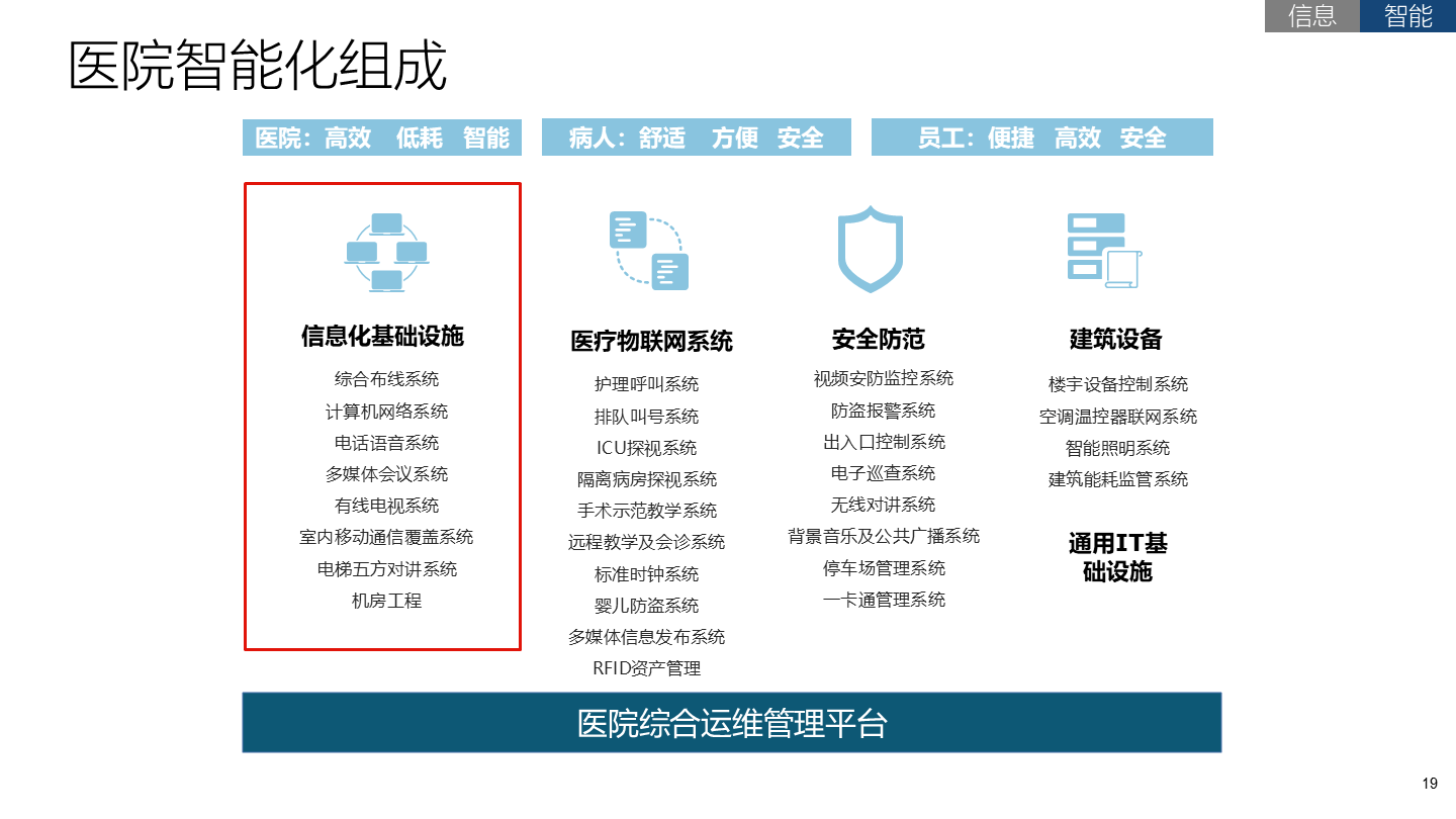 智慧医疗是智慧城市的一个重要组成部分,通过大数据、云计算技术的深度融合打造健康档案区域医疗信息平台,利用最先进的物联网技术,实现患者与医务人员、医疗机构、医疗设备之间的互动,逐步达到信息化与智能化。