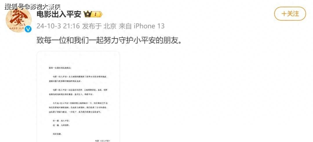话说这《出入平安》,9 月 30 日上映,才几天,就遇到“前所未有的困难和挑战”,票房刚过 1800 万就撤了,片方表示“遗憾未能与更多满怀期待的观众见面”,这可把观众们给整懵了。