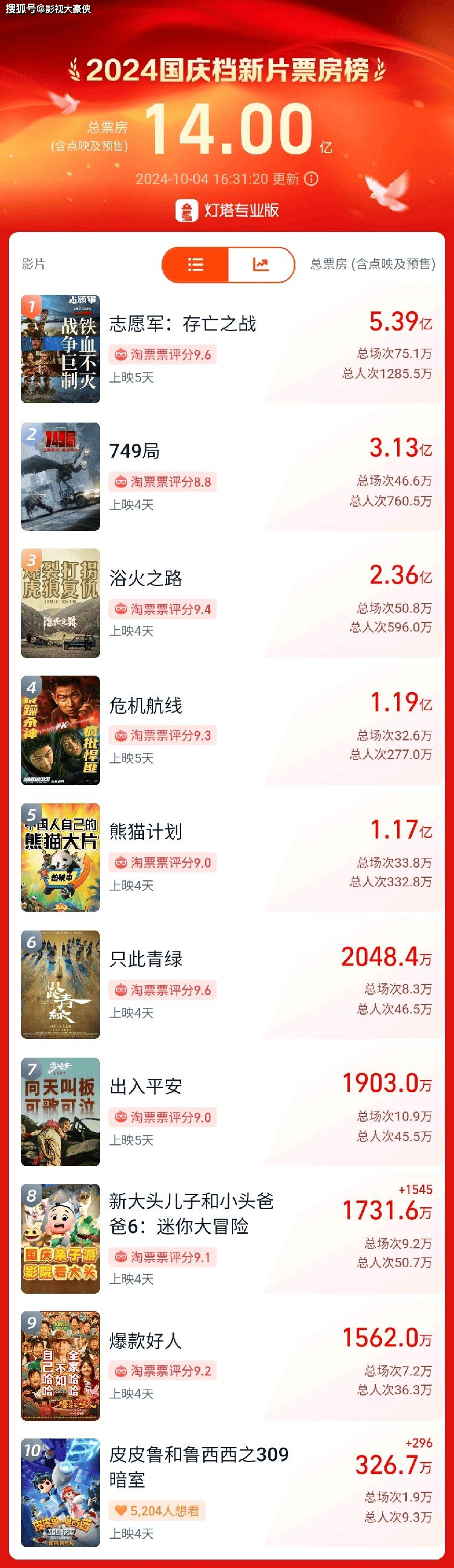 《志愿军:存亡之战》一马当先,淘票票开分 9.6,豆瓣 7.5,票房预测连续 3 天上调,有望超 14 亿。《749 局》首日超 1.7 亿,累计票房已超 3 亿。《浴火之路》上映第三天票房反超至第二,淘票ID:票票评分 9.5。成龙主演的《熊猫计划》票房逆跌,家庭观众爱惨了。还有《只此青绿》跟《志愿军:存亡之战》并列第一,评分 9.6,家庭观众也很青睐。