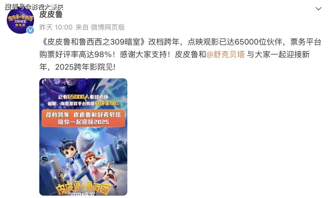 还有那部动画电影《皮皮鲁和鲁西西之 309 暗室》,10 月 1 日上映,两天后也宣布撤档,改档跨年。片方说“档期竞争太激烈,留给儿童电影的空间太小”,截至 10 月 4 日累计票房才 300 多万,这票房成绩确实有点惨淡。