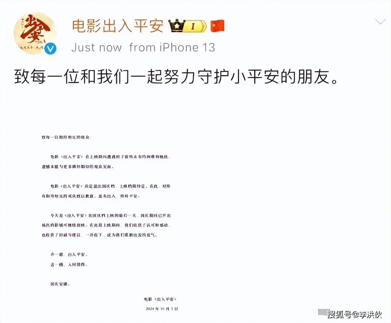10月3日晚,电影《出入平安》发文正式宣布撤档,文中提到“上映这段时间遇到了前所未有的挑战和困难”。