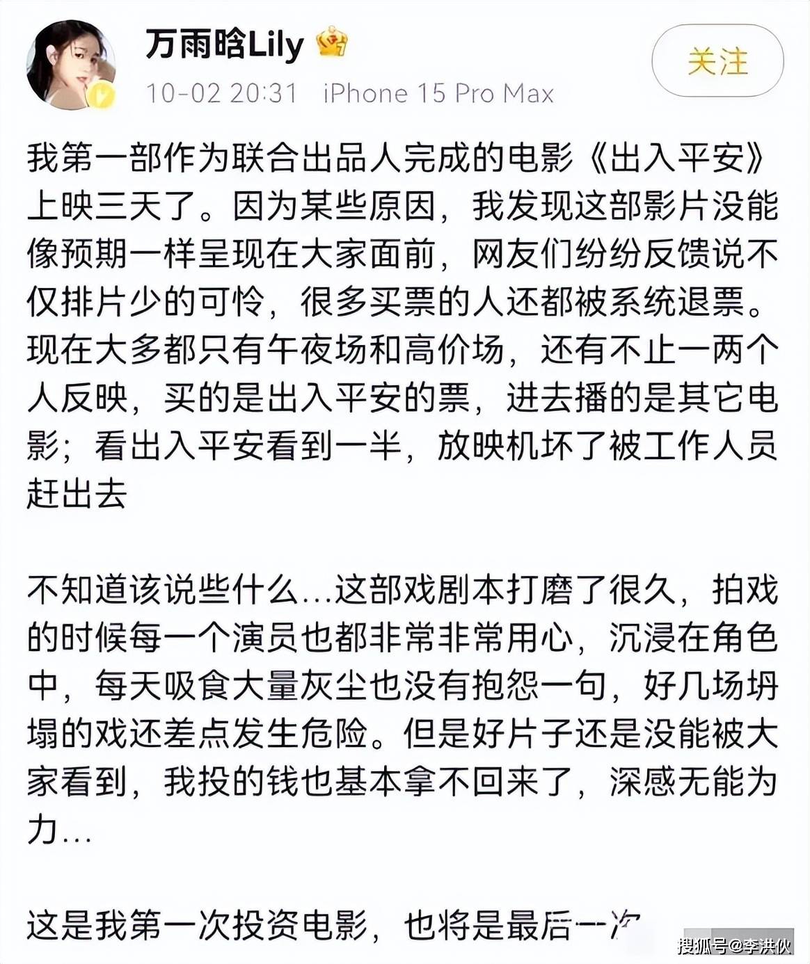 万雨晗借着影迷的评论暗示《出入平安》动到了某些人的蛋糕,才让这部好戏无法被更多人看到,而自己第一次投资电影也血本无归,让她直言“这也是最后一次投资电影”。