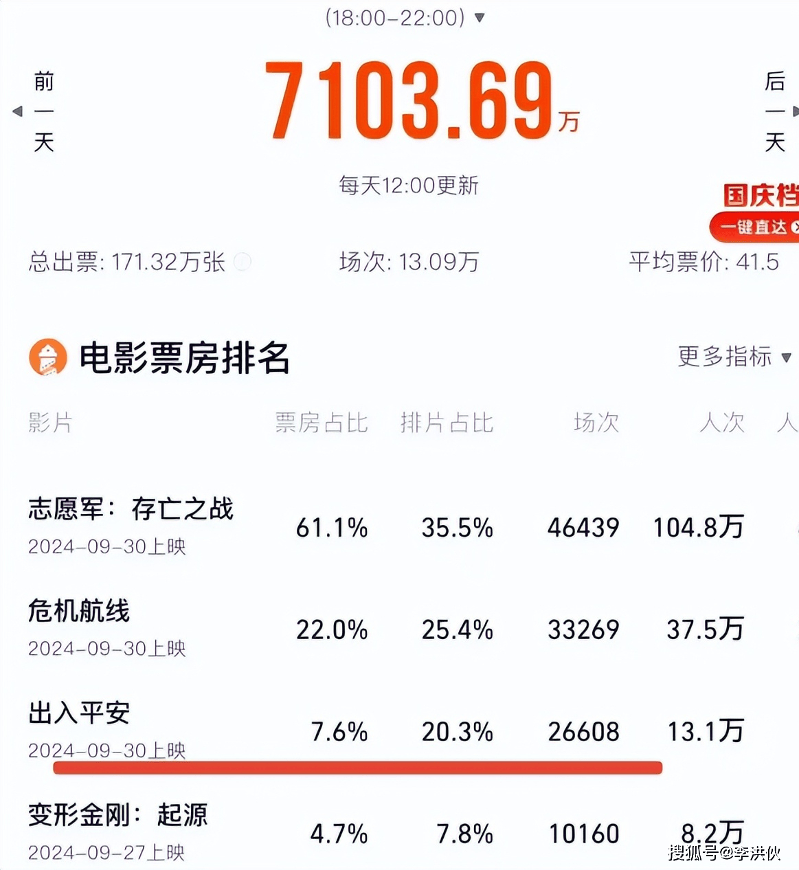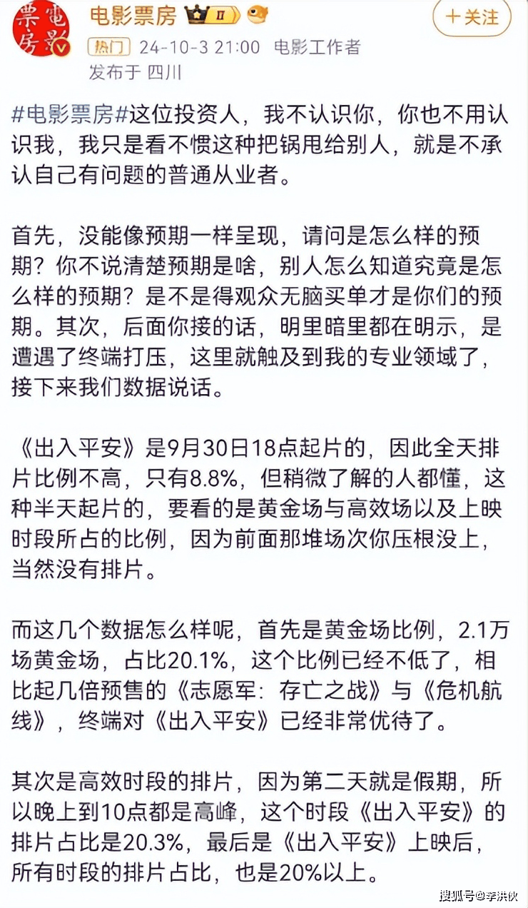 并且,从专业角度分析《出入平安》票房不理想的原因,摆出数据表示这部电影上映隔天高峰时段的排片率并不低,此后越来越低的排片则是电影本身分数不高造成的,直接否认排片存在受到打压的不公平待遇。