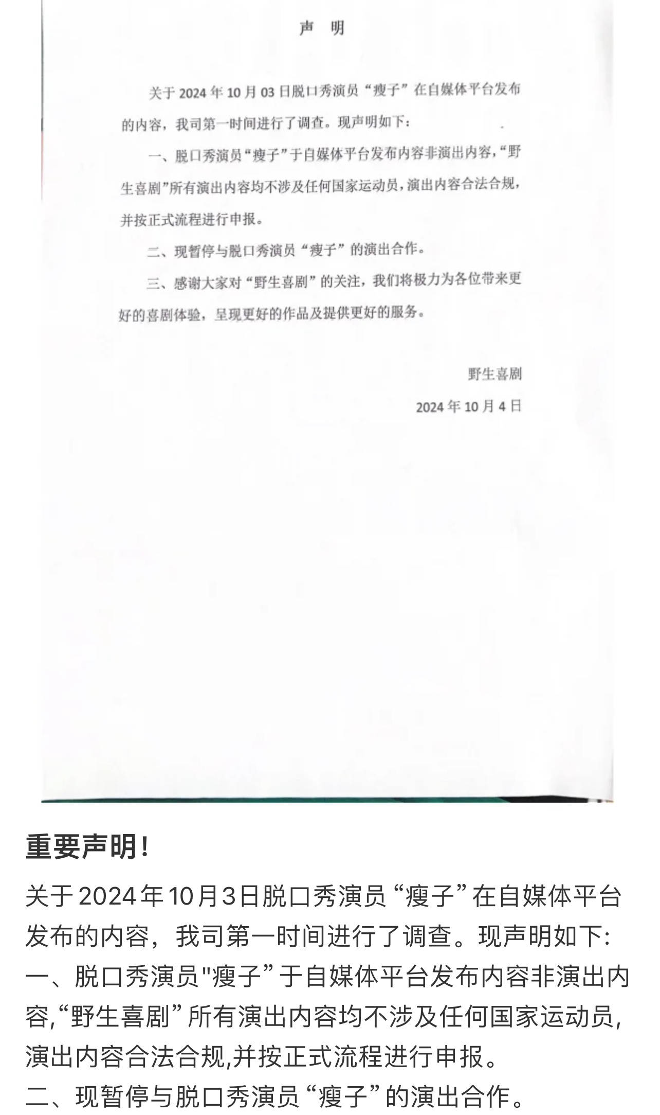 搜狐娱乐讯 近日,脱口秀演员瘦子在自己的账号发了调侃王楚钦和“莎头”组合的内容,被粉丝投诉。随后广州野生喜剧脱口秀发声明回应称,瘦子在自媒体平台所发布的并非演出内容,现暂停与瘦子的演出合作。