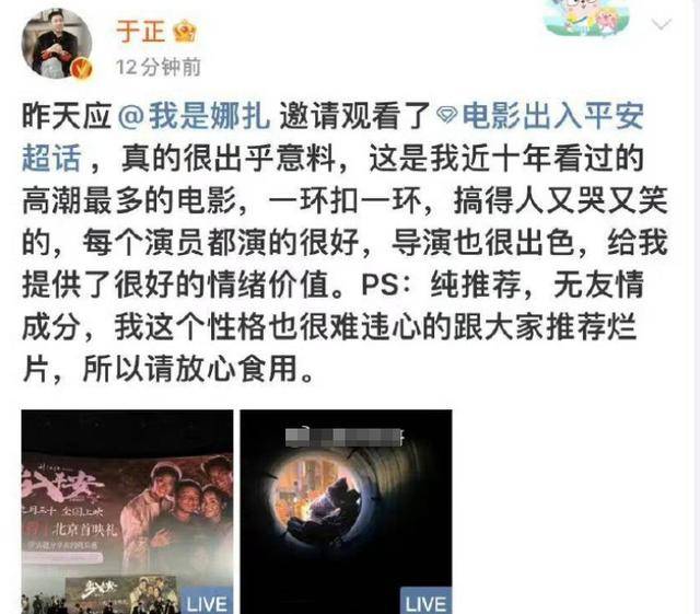 其次,节日档期气氛压抑,对观众吸引力较小。与国庆档的《志愿军2》相比,《出入平安》并无优势,再战江湖已是困难重重。因此,撤档或许是唯一的选择。希望影片能够在未来找到更适合的上映时机,重新赢得观众的青睐。于正就夸过这部电影,说内容很好看。