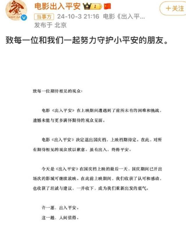 排片和票房的表现并不如人意,这也加大了撤档的必要性。8-9月份连想看的电影都没有,全部扎堆国庆,排片不合理的影片真的吃亏。换个时间上也不错。或许,影片制作方可以在未来找到更适合的上映时机,重新吸引观众,获取更好的票房表现。希望《出入平安》的未来能够有所改善,重新赢得观众的青睐。