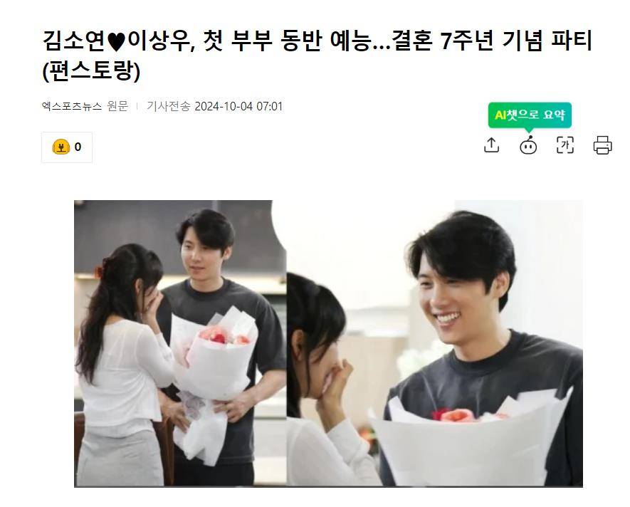 10月4日,有韩国媒体报道,4日播出的综艺节目《Pyeon餐厅》,韩国演艺界代表夫妻,李尚禹和金素妍将出演结婚7年首次同框综艺。