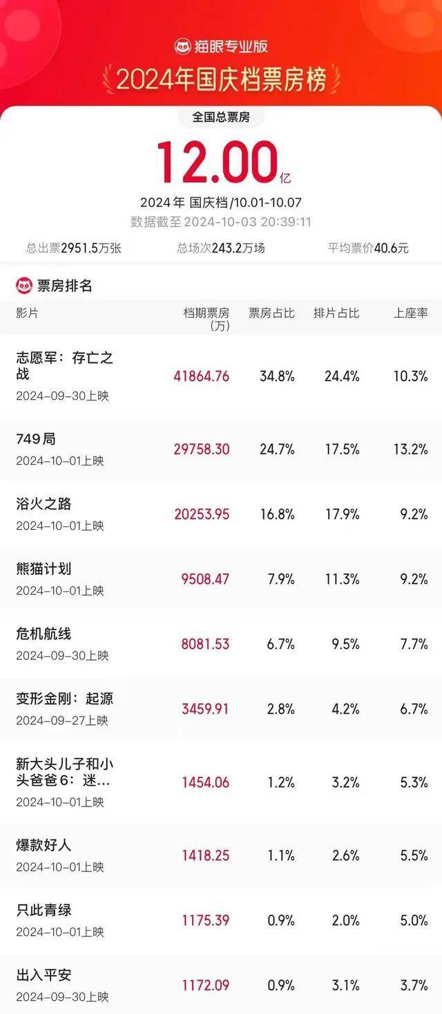 据猫眼专业版数据,截至10月3日20时39分,2024年国庆档档期(10月1日-10月7日)票房破12亿,《志愿军:存亡之战》《749局》《浴火之路》分列国庆档票房榜前三位。