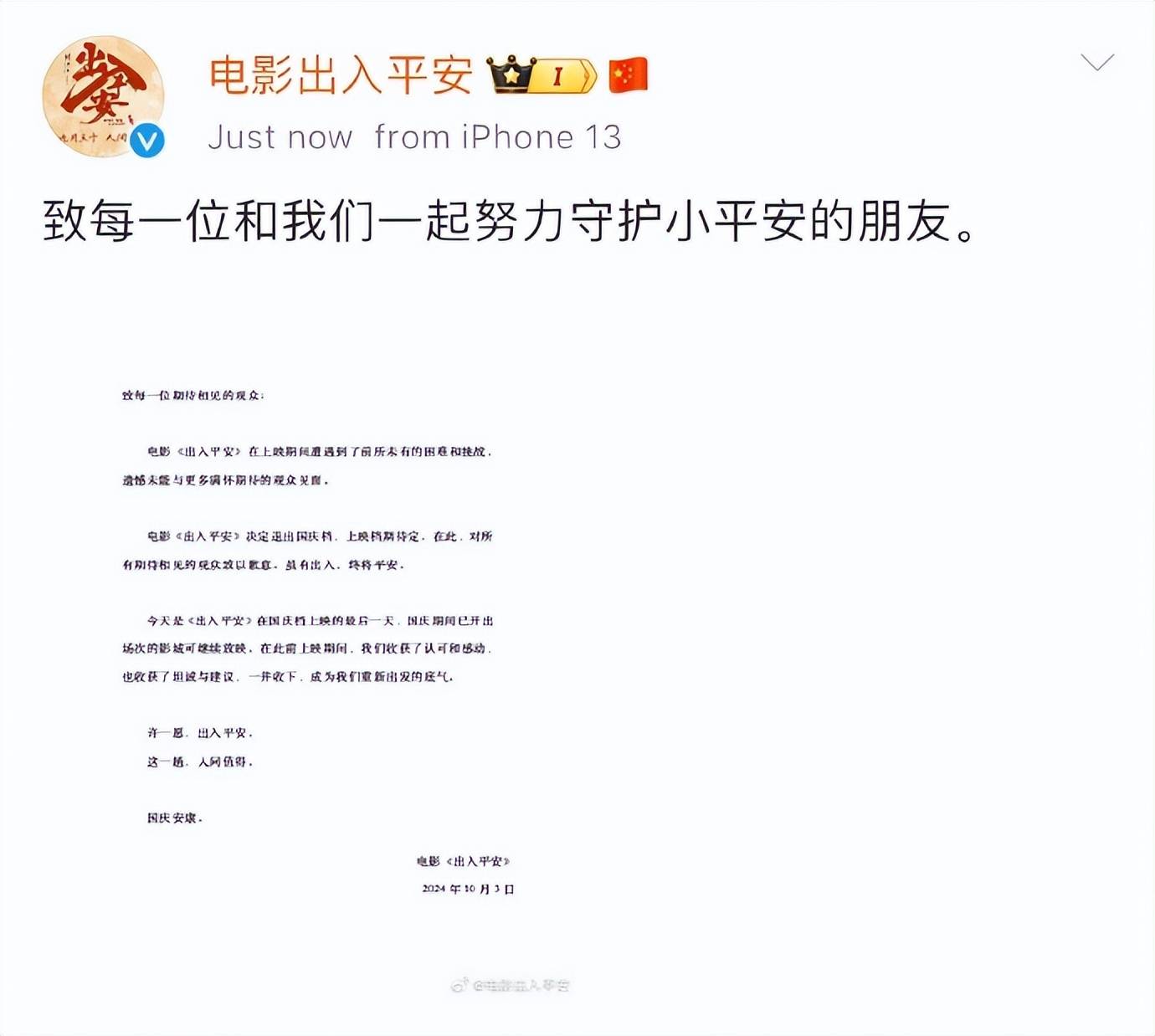 但《749局》不算国庆档最悲情的电影,《出入平安》不是垫底的,但票房一直没突破两千万,票房很是失望,选择了撤档,这种不算很妥的选择,虽然无奈,但也遭差评,成为国庆档最悲情的电影。