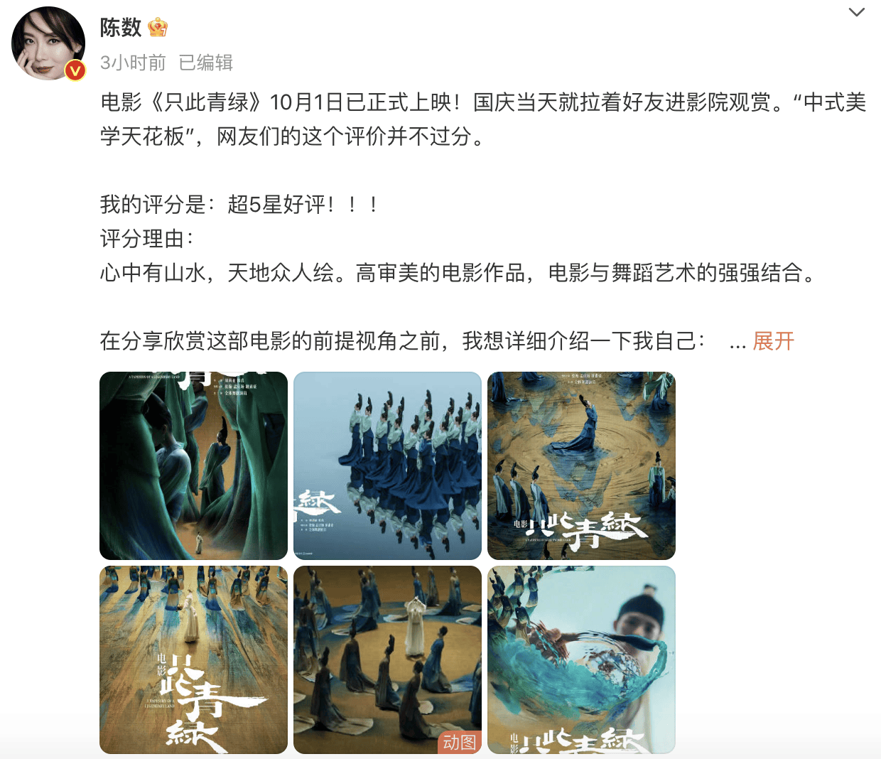 搜狐娱乐讯 3日,陈数在社交平台上发长文爆赞电影《只此青绿》,她在国庆当天就拉着好友进影院观赏,还夸该影片是“中式美学天花板”。