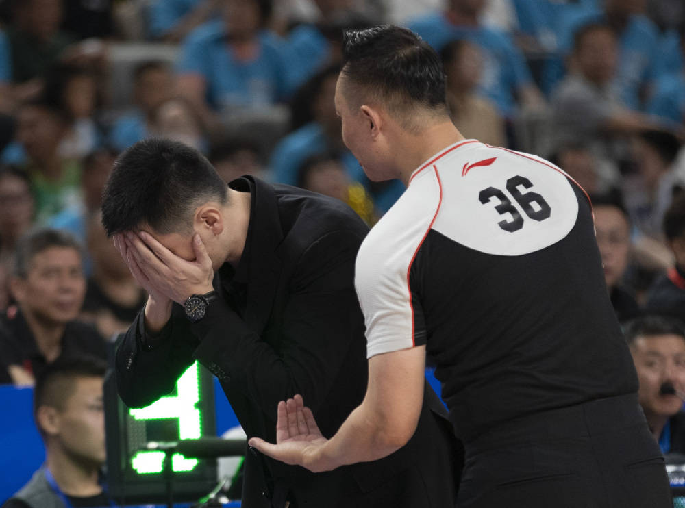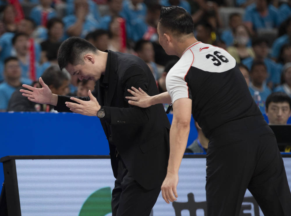 5月20日,辽宁本钢队主教练杨鸣(左)在比赛中对裁判判罚表示不满。新华社记者 雒圆 摄