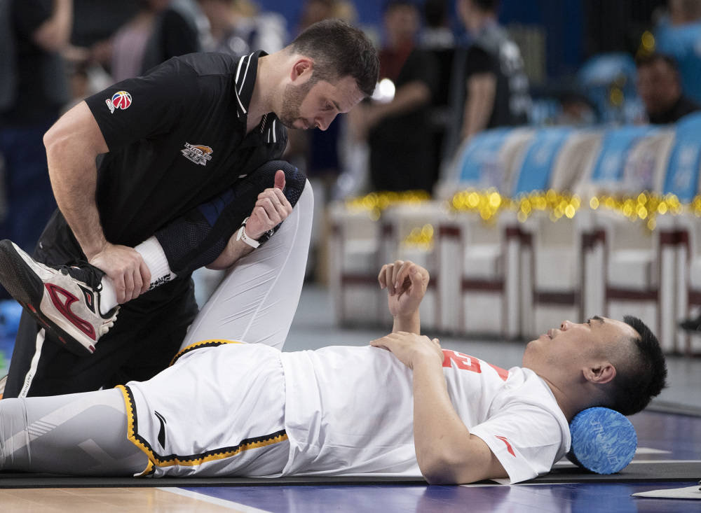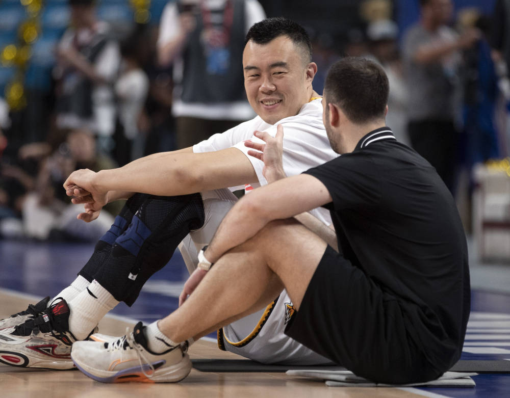 5月20日,辽宁本钢队球员韩德君(右)在比赛前热身。新华社记者 雒圆 摄