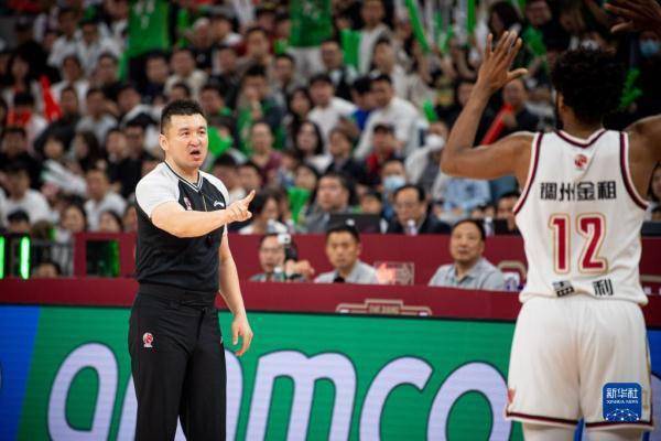 5月10日,第一副裁判杨晓光(中)向浙江稠州金租队球员吴前(左)解释判罚。新华社记者 江汉 摄