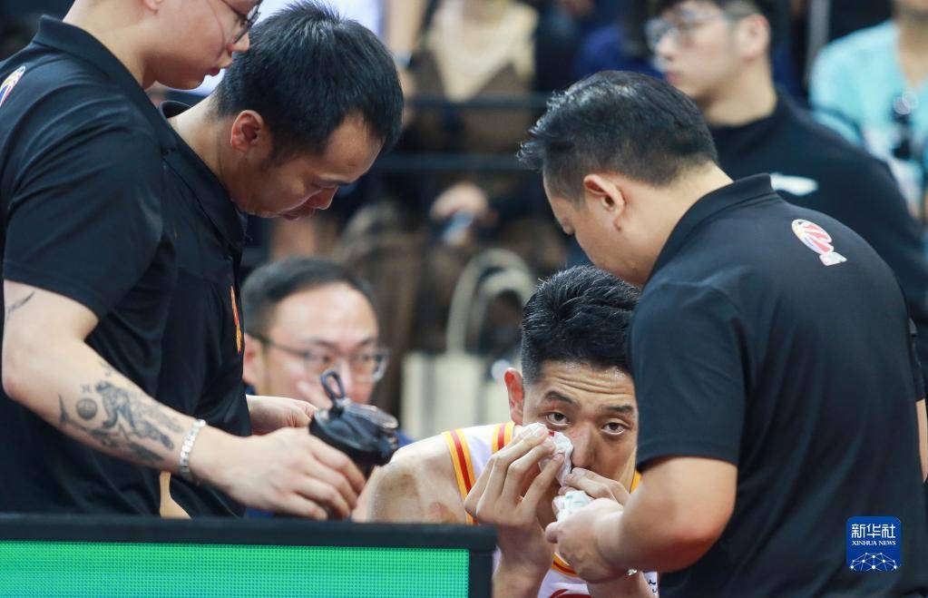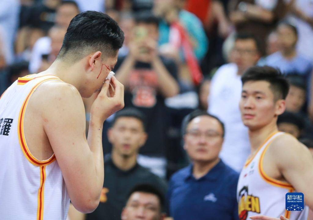 4月30日,深圳马可波罗队球员沈梓捷(右二)在比赛中受伤后返回替补席。