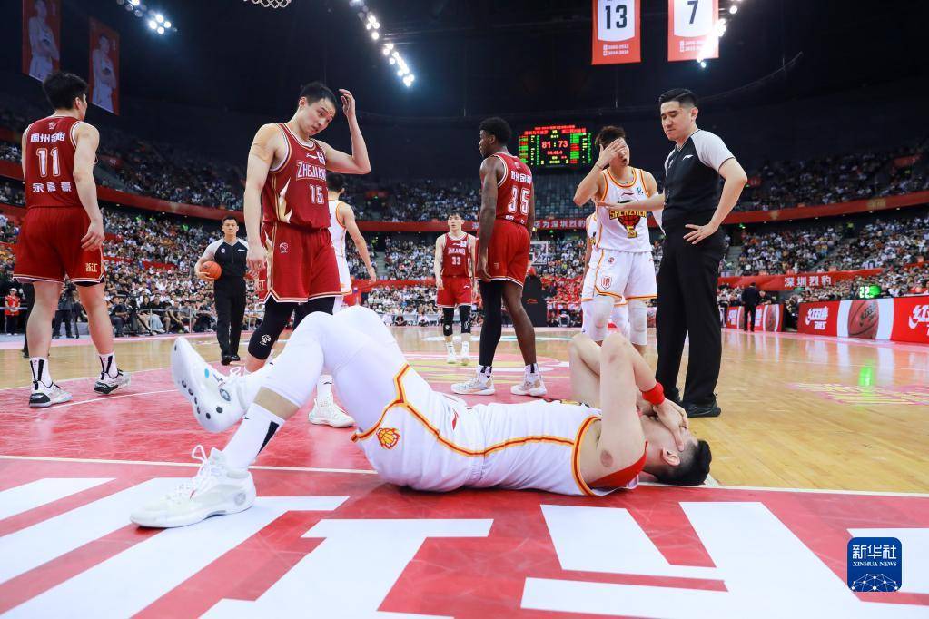 4月30日,深圳马可波罗队球员沈梓捷(下)在比赛中受伤倒地。