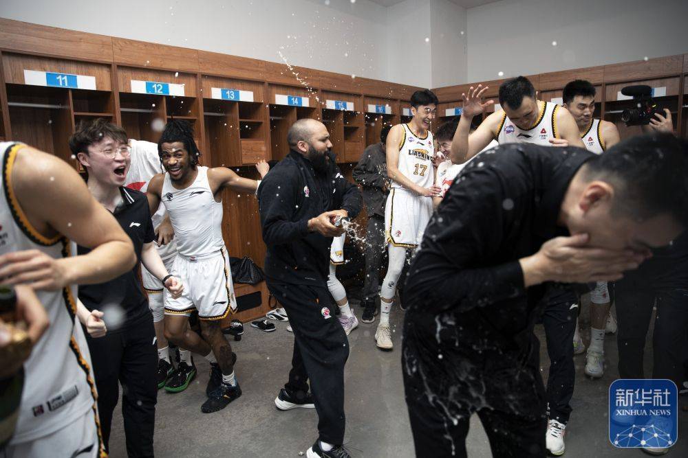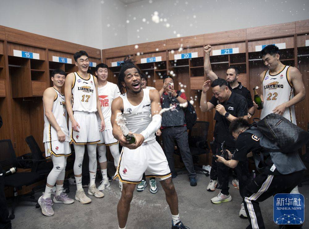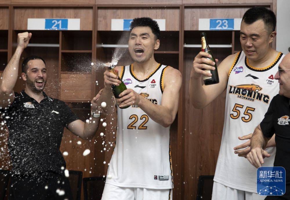 ↑辽宁本钢队球员库珀(前)在球队更衣室喷洒香槟庆祝。