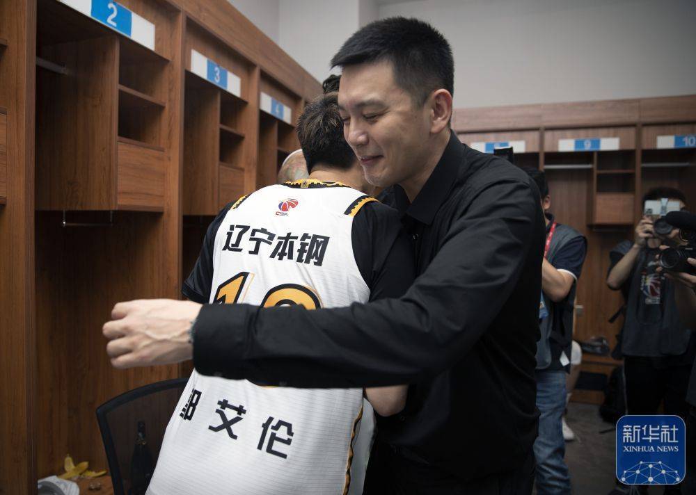 ↑辽宁本钢队主教练杨鸣(右)在球队更衣室拥抱球员郭艾伦。