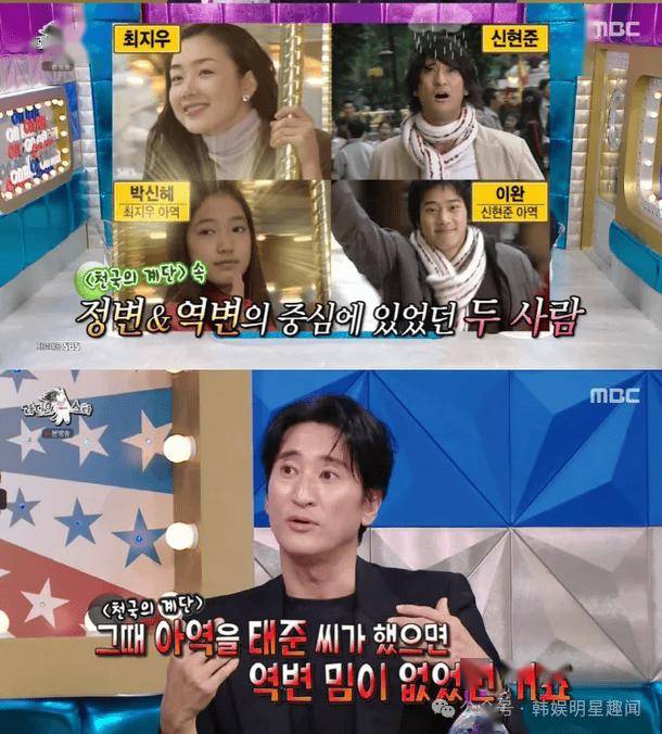 申贤俊说:“当我看到泰俊时,我想,他看起来像我”,并补充道,“在拍摄《天国的阶梯》时,信惠和我非常亲近,我认为信惠喜欢我”,引起了主持人的集体抗议。然而申贤俊却毫不在意,并补充道:“所以她才嫁给了和我长得很像的泰俊”,引得大家哈哈大笑。