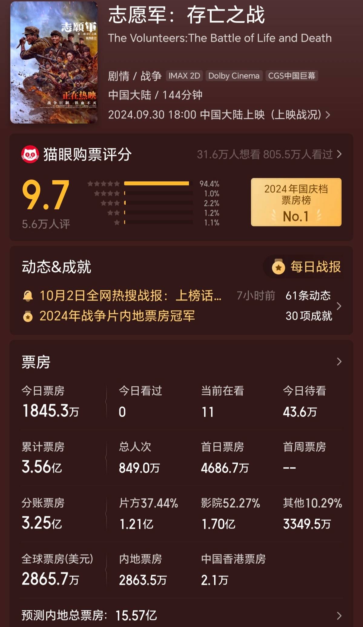 陈凯歌导演,朱一龙、辛柏青、张子枫、陈飞宇等主演的战争片《志愿军2》豆瓣开分7.5分,猫眼开分9.7分,是已开分的三部电影里口碑最好的。《志愿军2》票房走势也较稳定,首日票房1.53亿元,上座率21.8%,次日票房1.4亿元,上座率21.5%,日票房、上座率都成了第一,猫眼专业版预测其最终总票房可能冲16亿元,远超前作的8.68亿元。