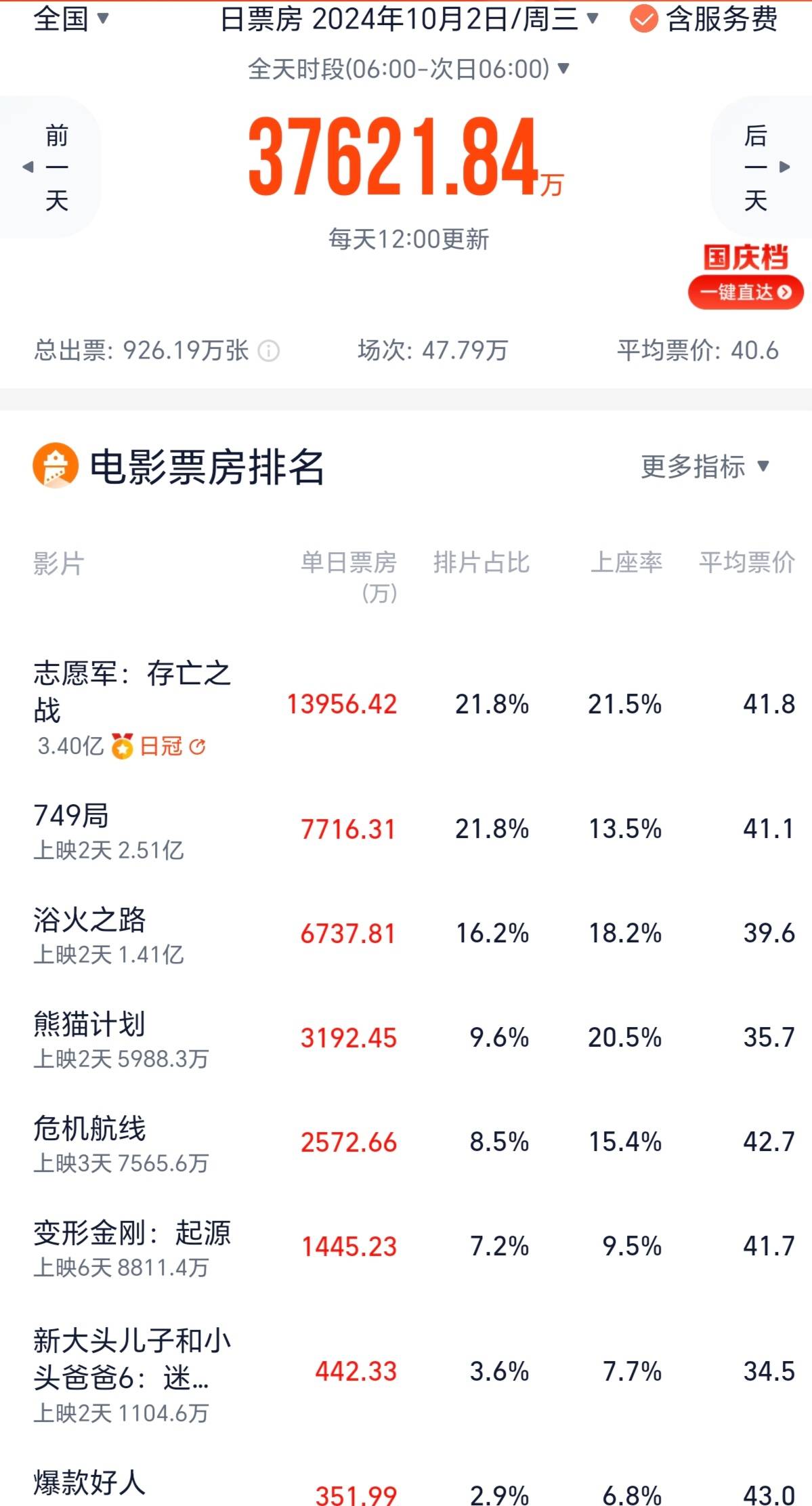 搜狐娱乐讯 (哈麦/文)国庆档第二天,全国电影票房3.76亿元,较首日的4.95亿元下滑24%。