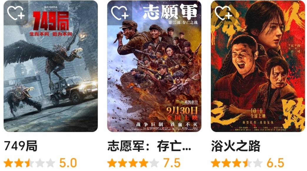 五百导演,肖央、赵丽颖、刘烨主演的打拐题材复仇片《浴火之路》豆瓣开分6.5分,猫眼开分9.3分。《浴火之路》首日票房7342万元,上座率16.8%,次日票房6738万元,上座率18.2%。《749局》高开低走后,《浴火之路》可能很快成为国庆档票房第二。