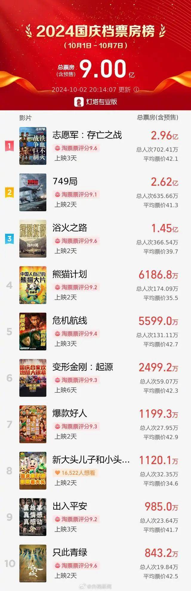 截止到10月2日,国庆档总票房(含预售)突破9亿元。2024年国庆档首日(10月1日国庆节)大盘票房4.70亿,超过去年国庆节同期票房;总人次1146万人,总场次46.4万场,刷新影史国庆节场次纪录。