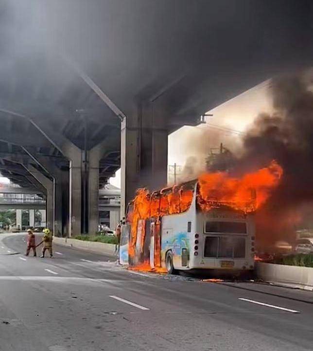 当地时间10月1日12时许,一辆载有6名教师和38名学生的大巴车行驶至泰国首都曼谷北郊时发生火灾。