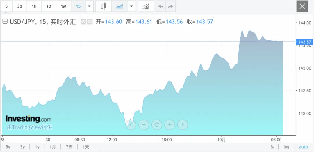 同时,市场的反应也非常剧烈,其中,美国两年期国债收益率短线从3.6%迅速拉升至3.65%上方,日内整体涨幅在鲍威尔讲话之际扩大至将近10个基点;美元兑日元汇率日内一度大涨超1%,现报143.57日元。