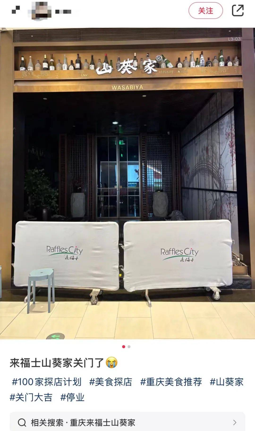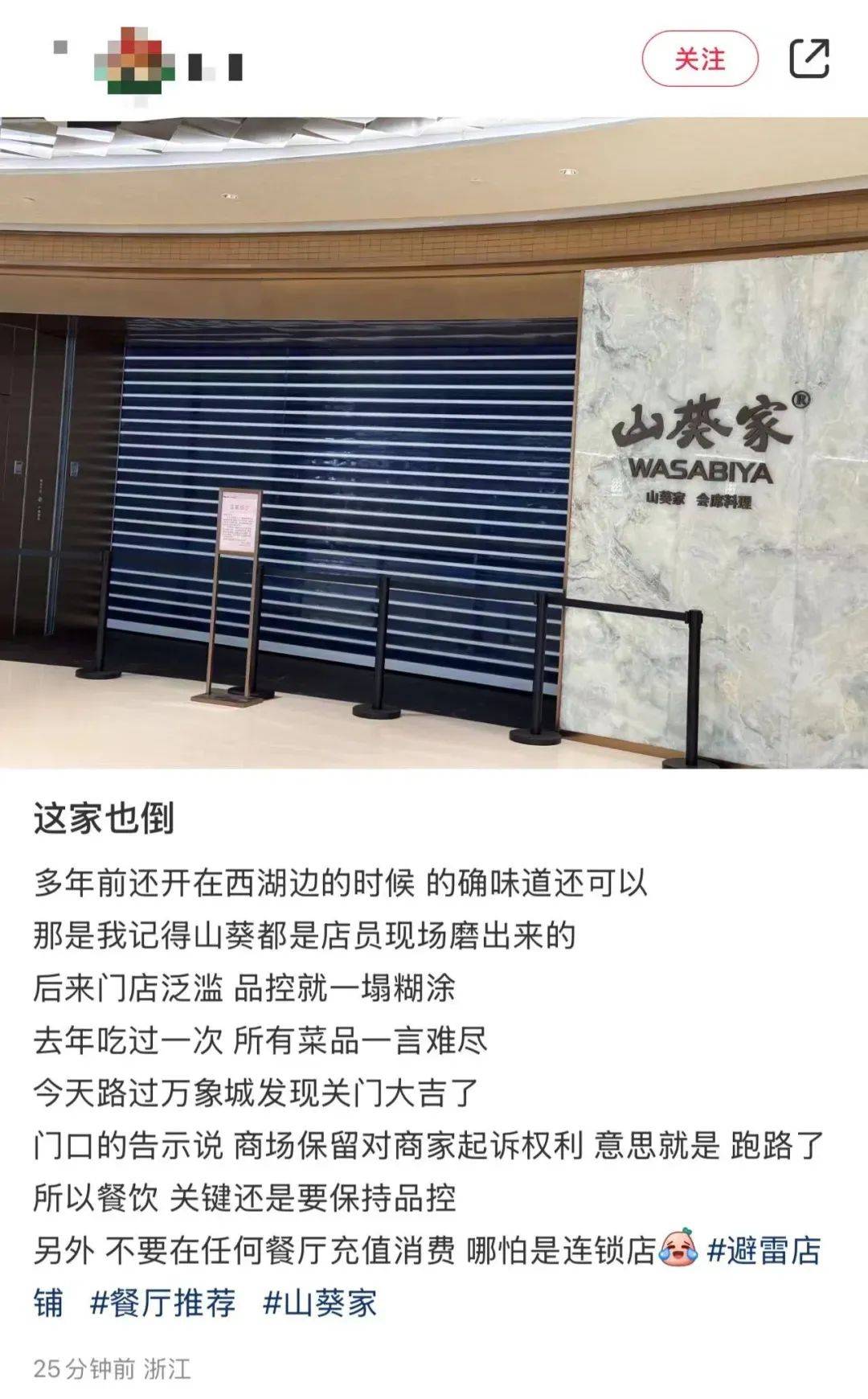 社交媒体上, 重庆、绍兴、西安、成都、福州等地的山葵家门店也都有闭店消息传出。