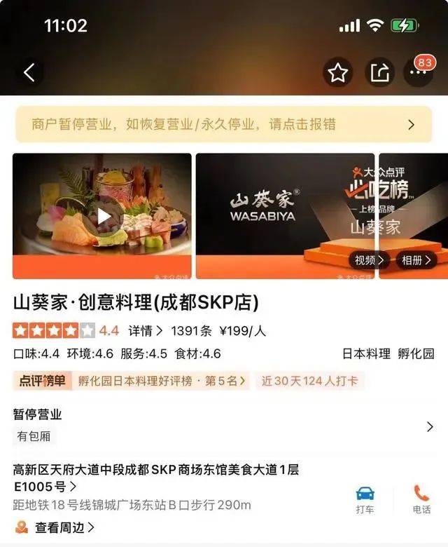 成都唯一一家山葵家·创意料理也出现经营异常情况,目前暂停营业。9月29日上午11时,门店已到所示营业时间,但大众点评显示该门店处于“暂停营业”状态,记者致电门店了解具体情况,工作人员接听后确认门店已暂停营业,因设备问题正在维护中,恢复营业时间不能确定。