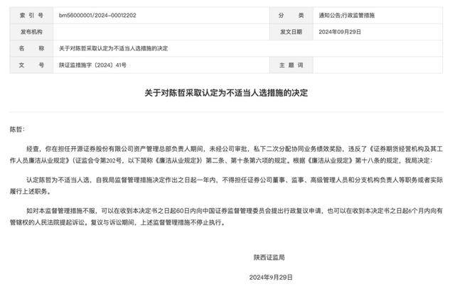 陈哲在担任开源证券股份有限公司资产管理总部负责人期间,未经公司审批,私下二次分配协同业务绩效奖励;