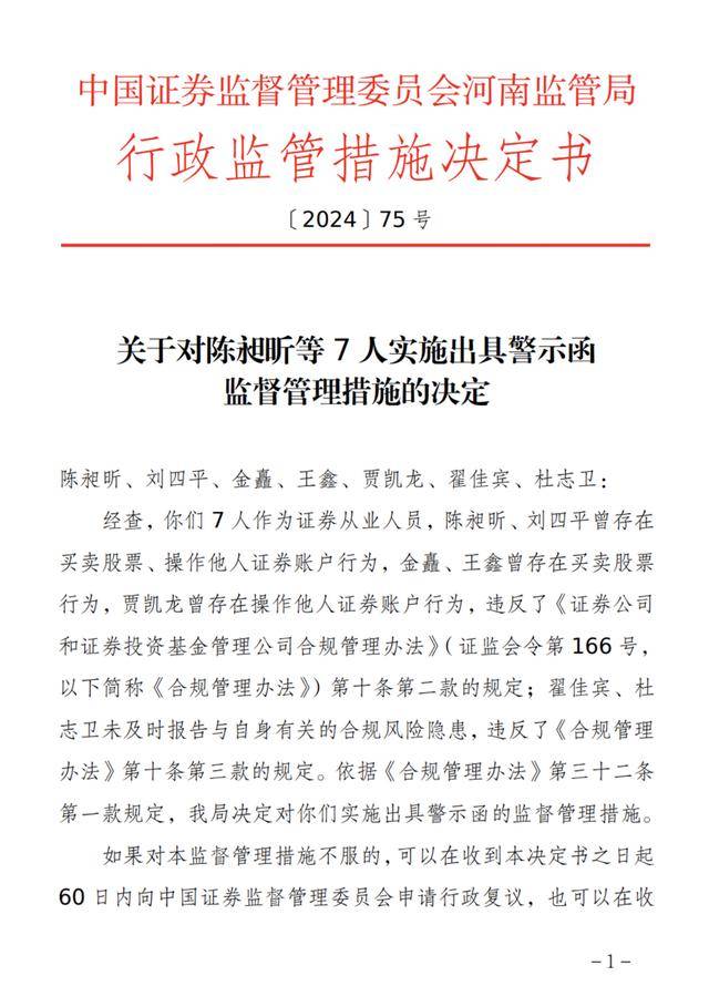 从罚单内容来看,陈昶昕、刘四平曾存在买卖股票、操作他人证券账户行为;金矗、王鑫曾存在买卖股票行为;贾凯龙曾存在操作他人证券账户行为;翟佳宾、杜志卫未及时报告与自身有关的合规风险隐患。由于上述7人分别违反相关规定,河南证监局最终决定对7人采取出具警示函的监督管理措施,成为中原证券的第二张罚单。