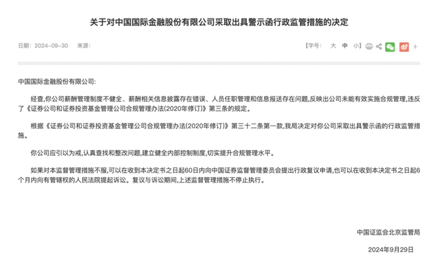 值得关注的是,中金公司也因薪酬管理制度及信息报送等问题在同日被罚,并被采取出具警示函的监管措施。