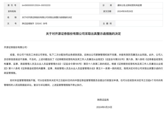 无独有偶,开源证券也在同日受到监管处罚。经查,发现公司个别员工未经公司审批,私下二次分配协同业务绩效奖励,反映出公司薪酬管理机制不完善,未能有效防范廉洁从业风险。此外,公司人员任职信息报送不准确、不及时。不仅公司被出具警示函,开源证券3名相关人员还被采取认定为不适当人选的监管措施。