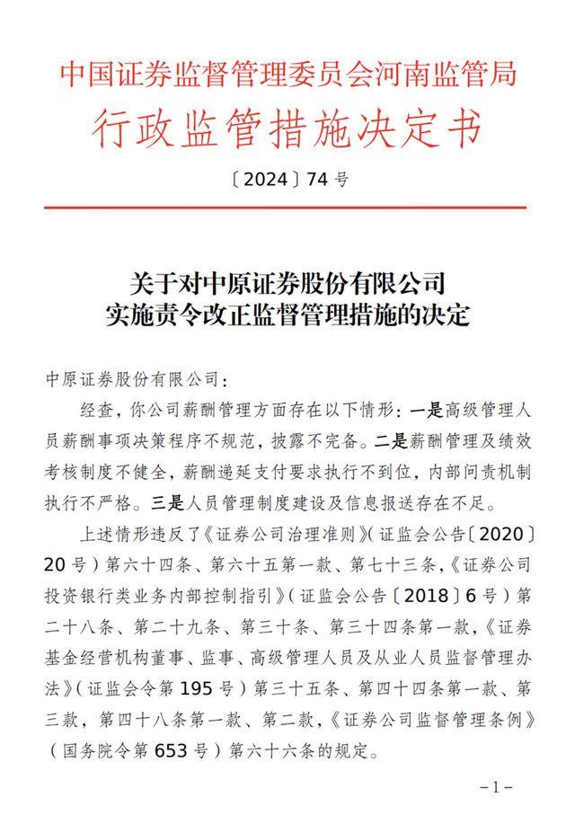 中原证券因上述行为被河南证监局实施责令改正的监督管理措施。同时,公司被要求应切实完善公司治理,健全薪酬管理、激励约束、追责问责机制,加强人员管理,并自收到本决定书60日内向监管提交书面整改报告。