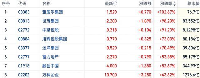 截至发稿,雅居乐集团(03383.HK)日内走出翻倍行情,世茂集团(00813.HK)也接近翻倍;中梁控股(02772.HK)涨超90%,旭辉控股集团(00884.HK)、远洋集团(03377.HK)双双涨超70%。富力地产(02777.HK)、万科企业(02202.HK)跟涨逾40%。
