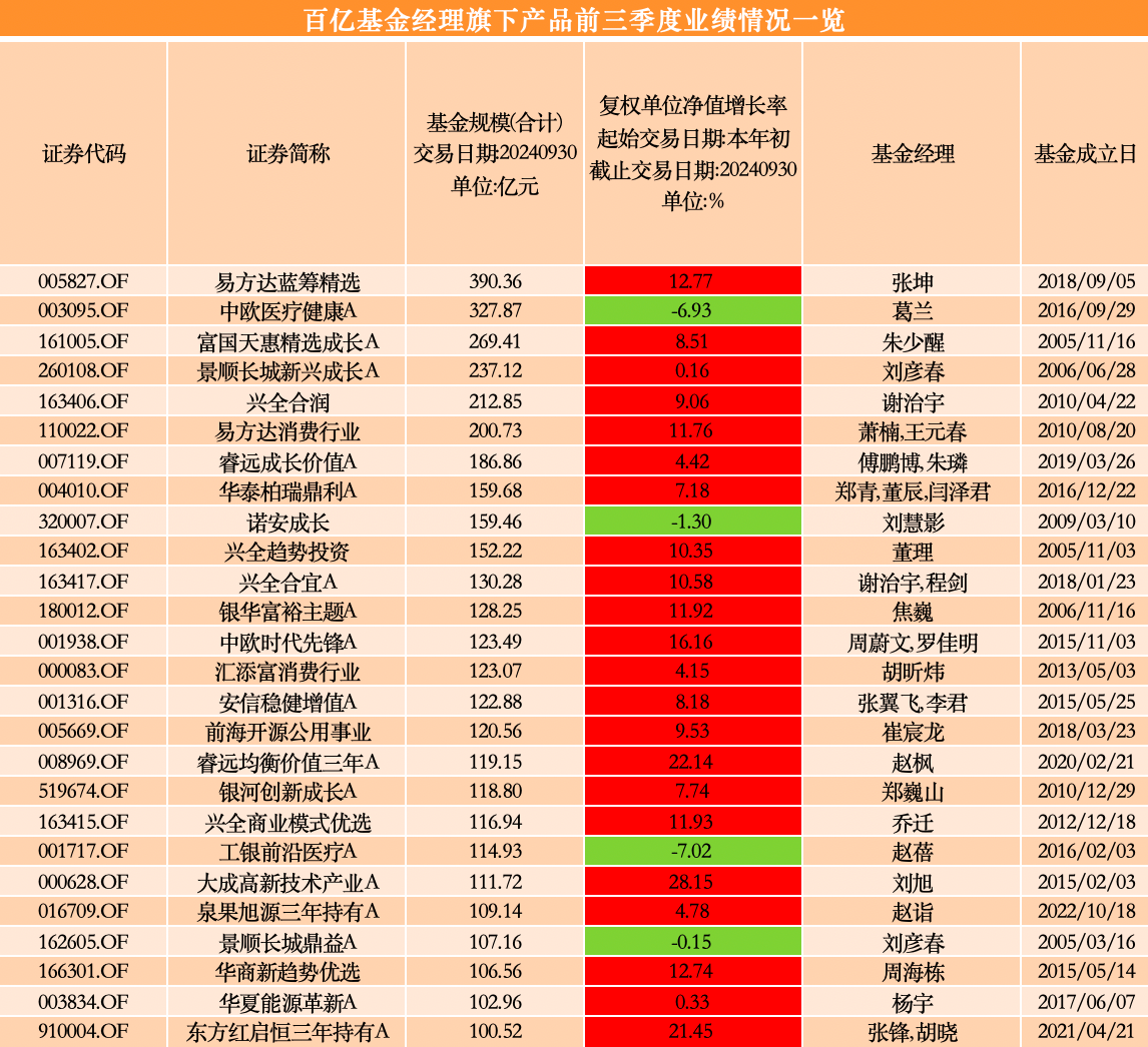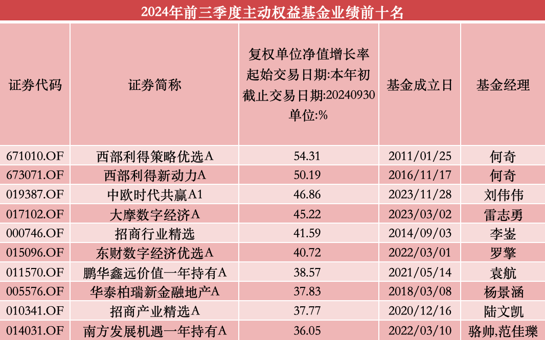2024年前三季度主动权益基金业绩出炉,两只“冠亚基”收益超50%,超八成百亿级主动权益基金悄然“回血”。