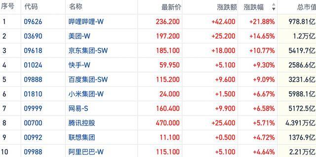 盘面上,核心科技股保持强势,美团涨超14%,京东涨逾10%,快手、百度涨9%以上,小米、网易跟涨6%左右。