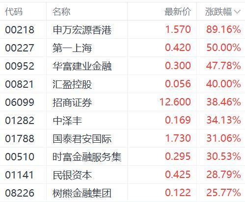 财联社10月2日讯(编辑 胡家荣)受益于政策利好,港股中资券商股延续近日涨势。截至发稿,申万宏源香港(00218.HK)、招商证券(06099.HK)、国泰君安国际(01788.HK)分别上涨89.16%、38.46%、31.06%。
