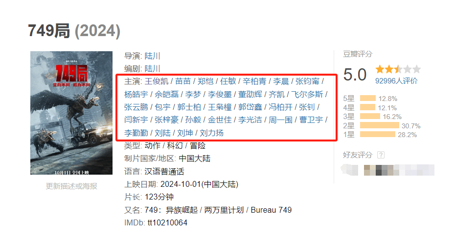 再者,陆川无疑是想借这部科幻怪兽大片打造他的“中国怪兽电影宇宙”和“749局IP”。一方面,花大力气专门设计了全新的世界观、外星生物形象、外星文字和语言,以及749局的标志、专属制服和武装直升机等武器;另一方面,下重本请来了王俊凯、苗苗、郑恺、任敏、张钧甯、杨皓宇、余皑磊等流量 实力派演员组成的主演阵容,其中光是领衔主演就有6位,这在一般电影中实属罕见。